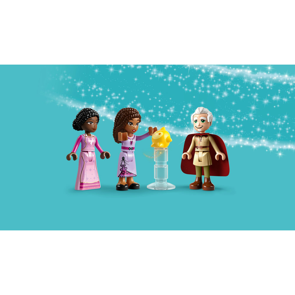 Visit Asha at home! The detailed LEGO Disney set welcomes you to Asha’s home in the Hamlet with her mum and granddad. Step inside the round, 2-level house and start exploring. Warm yourself by the fireplace as you look through Asha’s notebook. Check out the smiley-face cake, waiting for the right moment. Then head upstairs to the bedroom for a rest or outside to the wishing well and make a wish!