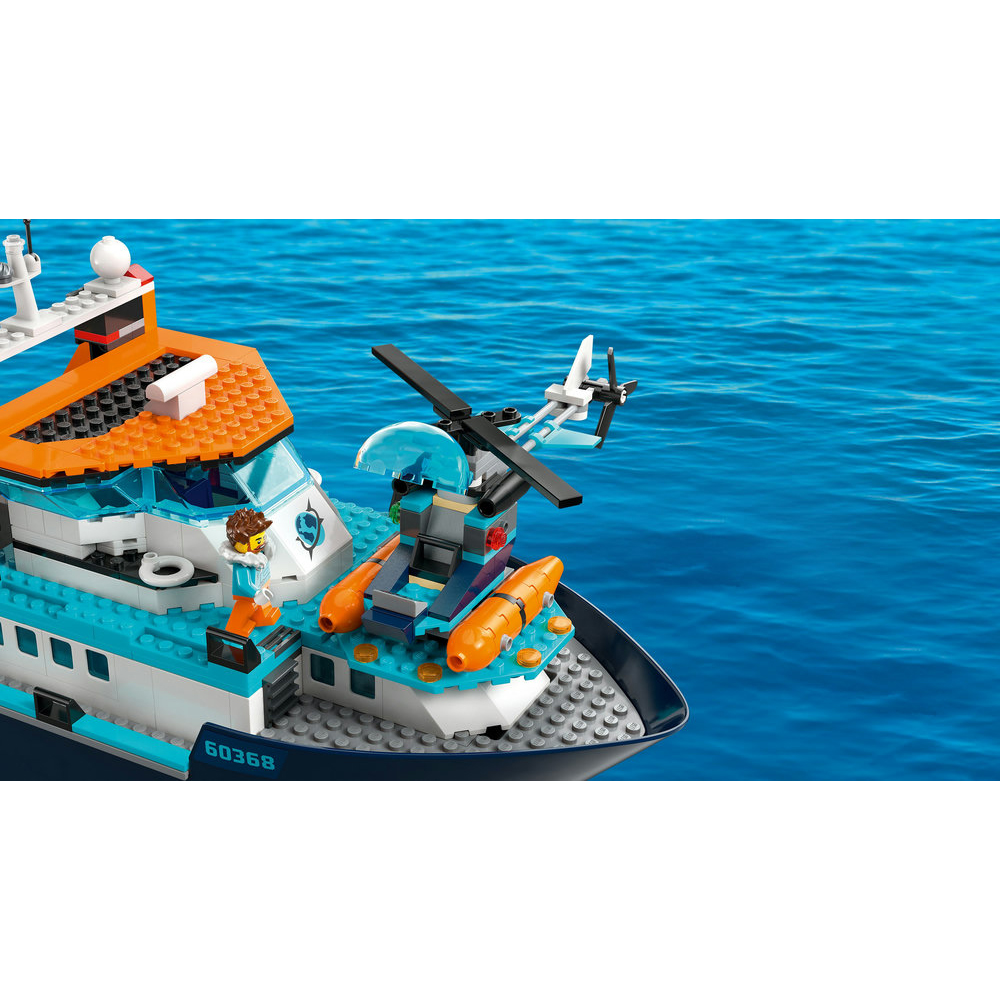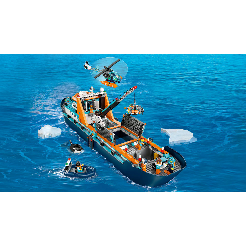 Fun adventures lie on the horizon with the mighty LEGO City Arctic Explorer Ship (60368). This huge floatable toy boat is loaded with realistic detailing for imaginative exploration adventures. This premium playset also includes a helicopter, dinghy, underwater ROV sub and a Viking shipwreck, plus a treasure chest, 7 minifigures and an orca figure.