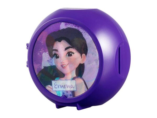 The set includes a mini-doll figure of Emma, equipped with her camera and a tripod, ready to capture the perfect shot. The studio pod itself features a cute pink and purple design, with a hinged carry handle for easy transportation. It also opens up to reveal a mini photo studio with a backdrop, lighting, and accessories such as a chair and a beauty box.