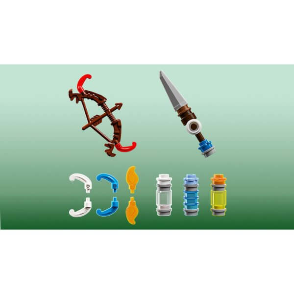 The set includes Aloy and Varl minifigures, each equipped with signature weapons—a bow for Aloy and a spear for Varl. Their weapons can be upgraded with fire, shock, or chill attack features, just like in the game. The fully articulated Shell-Walker has posable legs and arms, opening claws, a detachable cargo pod, and an energy shield, while the Sawtooth features a swiveling torso, opening jaws, and a posable neck, head, and legs for dynamic battles. Additional elements, including tall reeds, a campfire, and a treasure chest, help set the scene for imaginative storytelling.