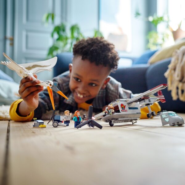 nRelive thrilling flying action from the Jurassic World: Dominion movie with this Quetzalcoatlus Plane Ambush (76947) toy playset for dinosaur-loving kids aged 7 and up. It features an aeroplane with space for 3 minifigures in its cockpit, spinning propellers, an opening cargo hold and engines designed to break off under attack by the posable Quetzalcoatlus toy figure (the engines reattach easily). Roleplay action The set comes with step-by-step building instructions and includes Owen Grady,Claire Dearing and Kayla Watts minifigures, plus a buildable fire extinguisher and flashlight and wrench accessory elements to inspire imaginative storytelling. Unlimited fun The LEGO® Jurassic World range has top gift ideas for kids and fans of all ages, with moulded, buildable dinosaur figures, minifigures and cool toy vehicles for play and display. Look out for Atrociraptor Dinosaur: Bike Chase (76945). It includes Owen’s motorcycle, which fits inside the plane in this set.