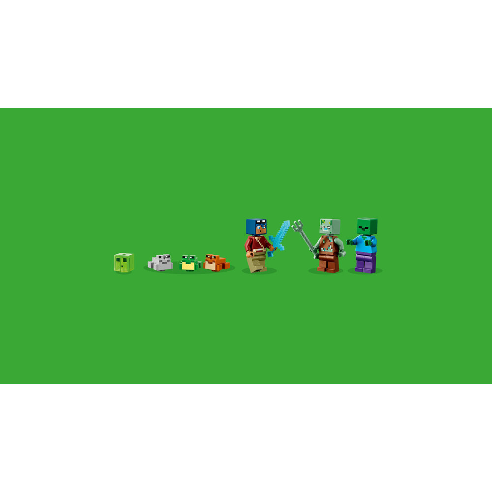 Includes a buildable house, Steve, a zombie, a drowned, a slime and 3 frogs